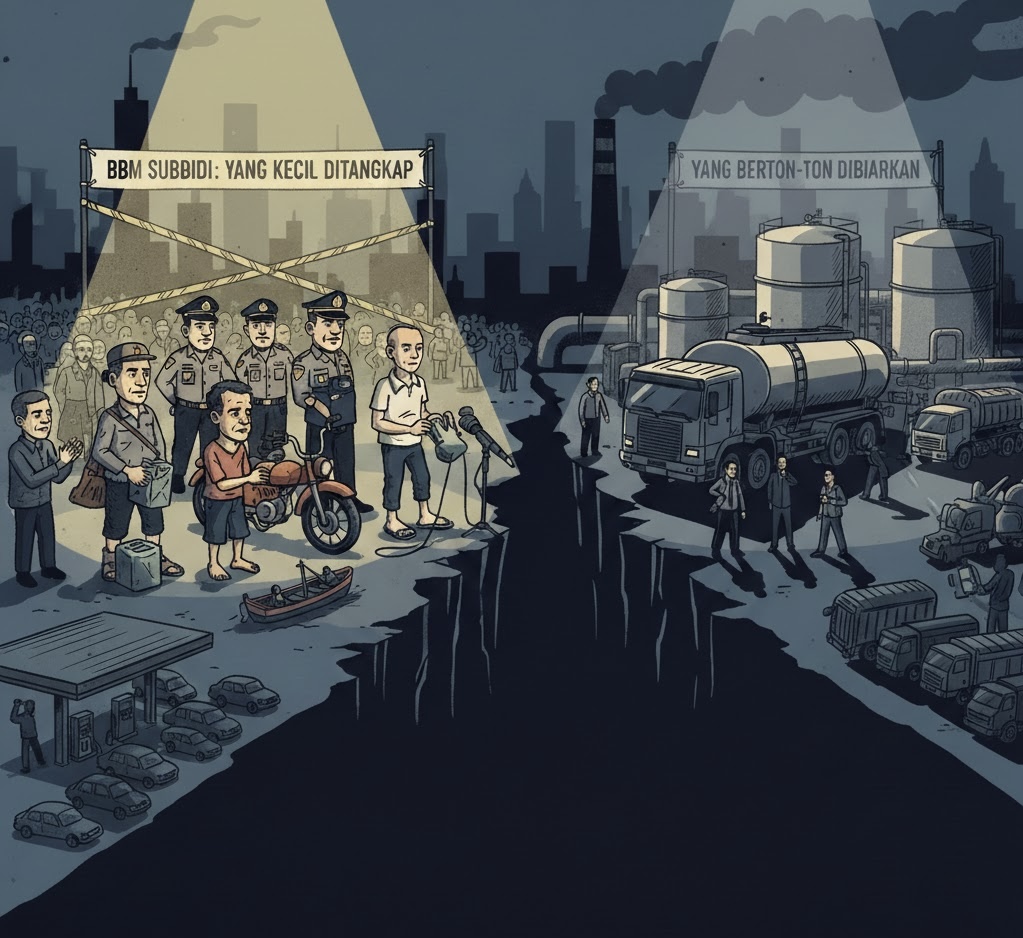 TATANDAK.ID – Di negeri ini, hukum tampaknya masih sangat teliti, asal yang diawasi adalah rakyat kecil. Satu jerigen, satu motor tua, satu nelayan, satu sopir angkot, cukup untuk menggerakkan aparat secara serius, lengkap dengan garis polisi dan konferensi pers.