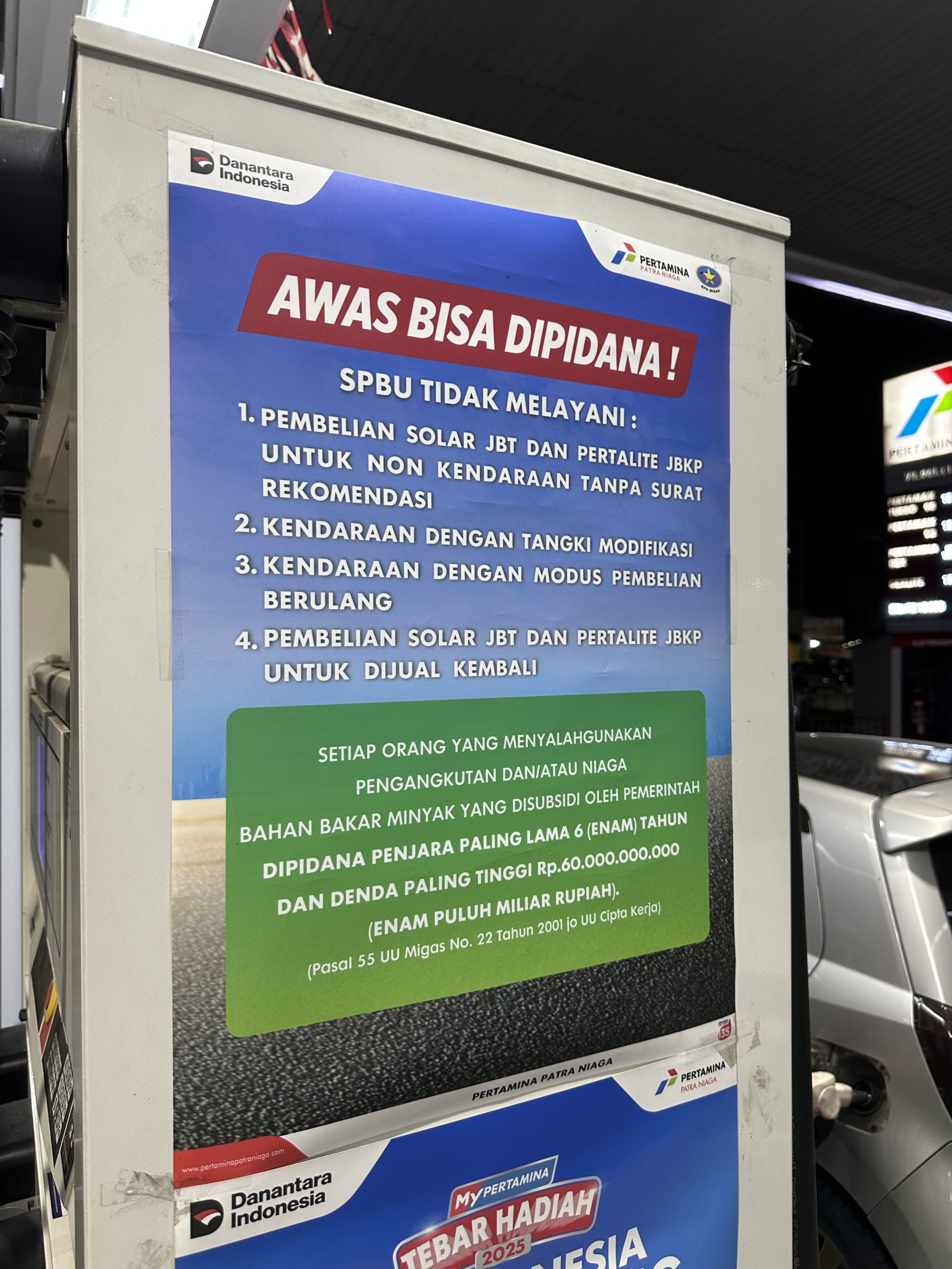 SPBU Pasang Peringatan: Penyalahgunaan BBM Subsidi Bisa Dipidana 6 Tahun Penjara dan Denda Rp60 Miliar